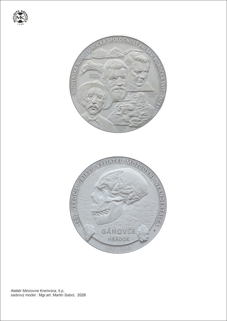 SNS pri SAV, pobočka Svit-Tatry pri príležitosti 100. výročia objavu výliatku mozgovne neandertálca v Gánovciach pripravuje medailu – foto sádrového modelu v prílohe.